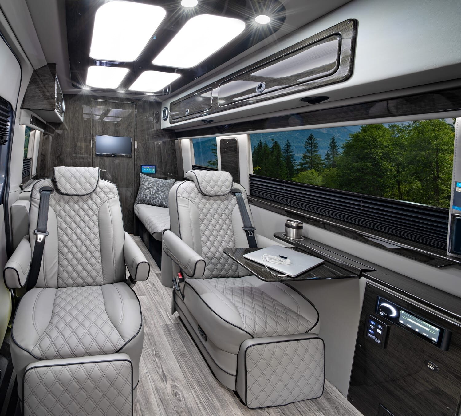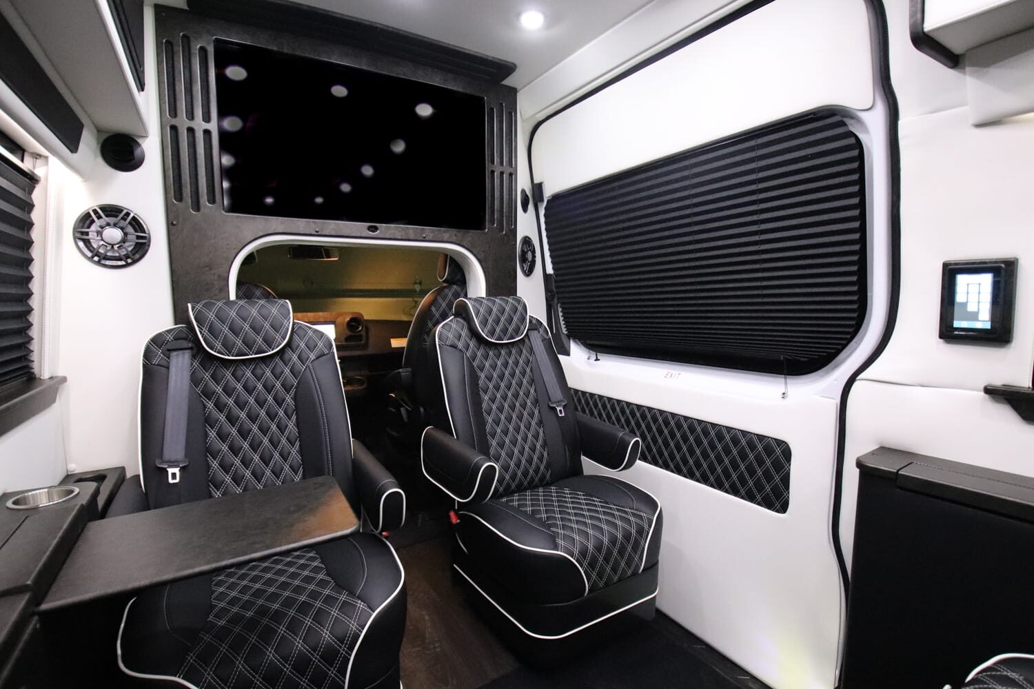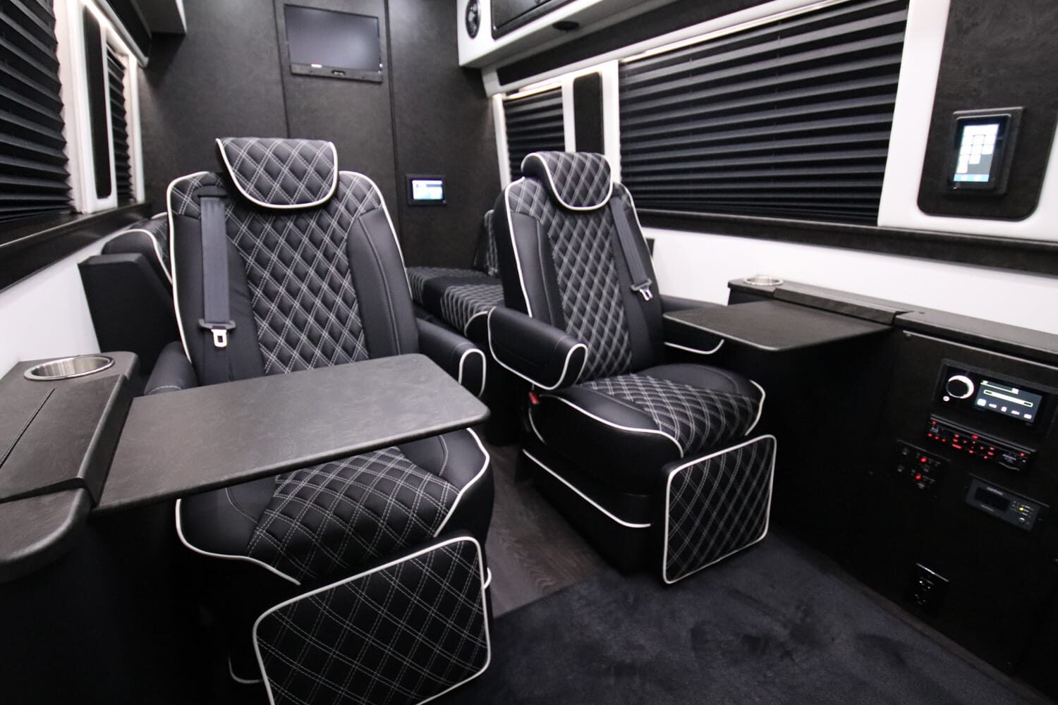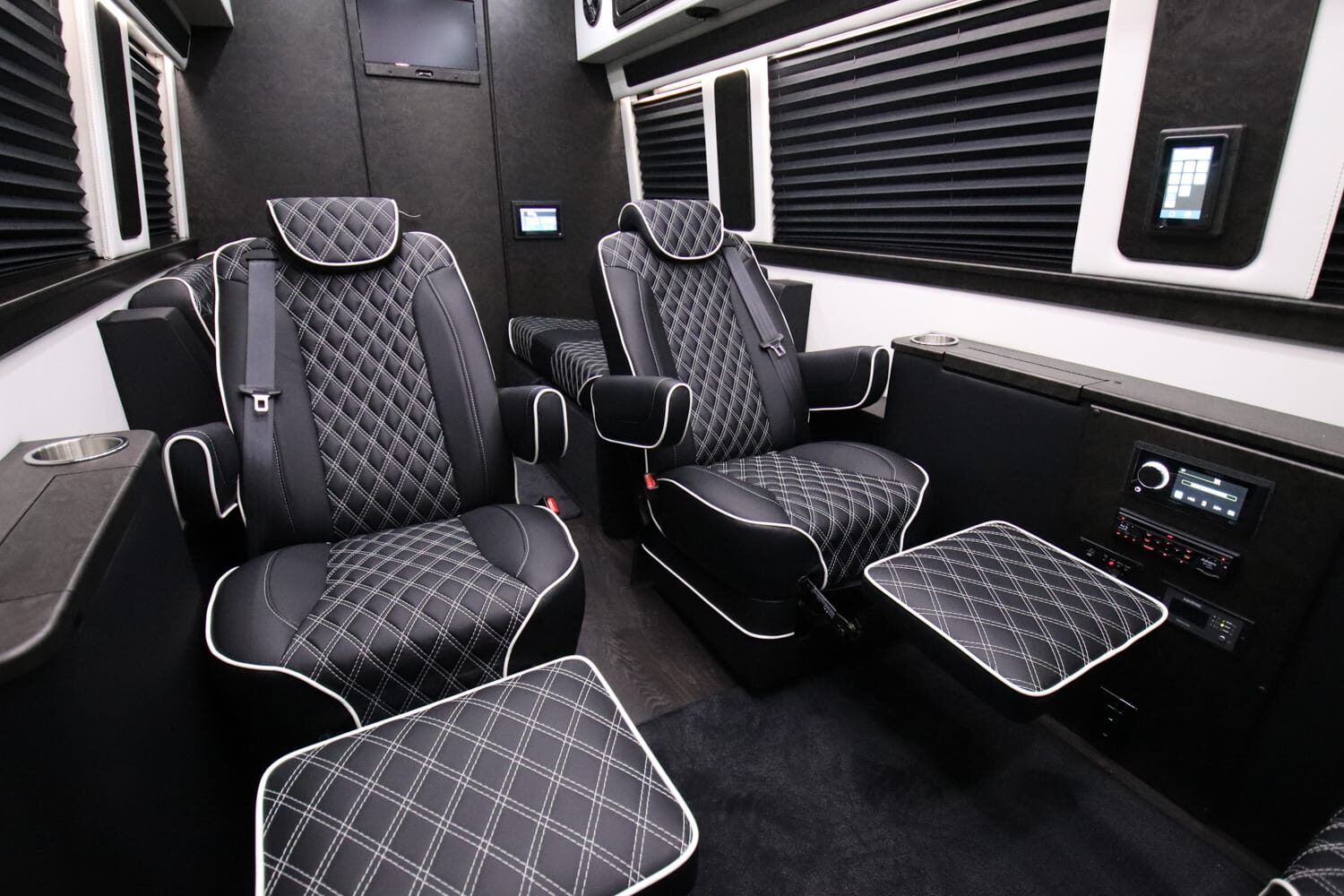 Full insulation, advanced rear climate control, and swivel captain’s chairs ensure comfort in any season. Privacy shades, tinted windows, storage solutions, and functional wall consoles with cup holders enhance the passenger experience.