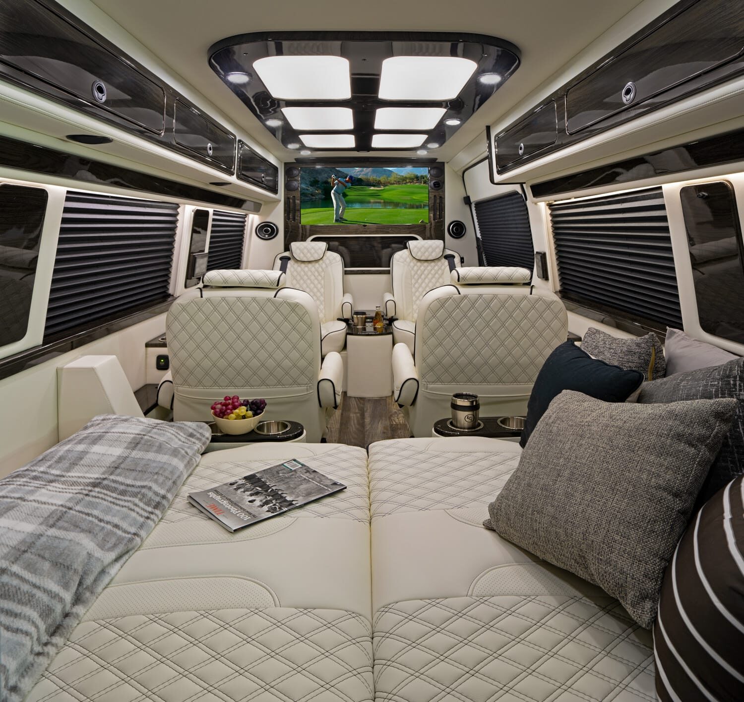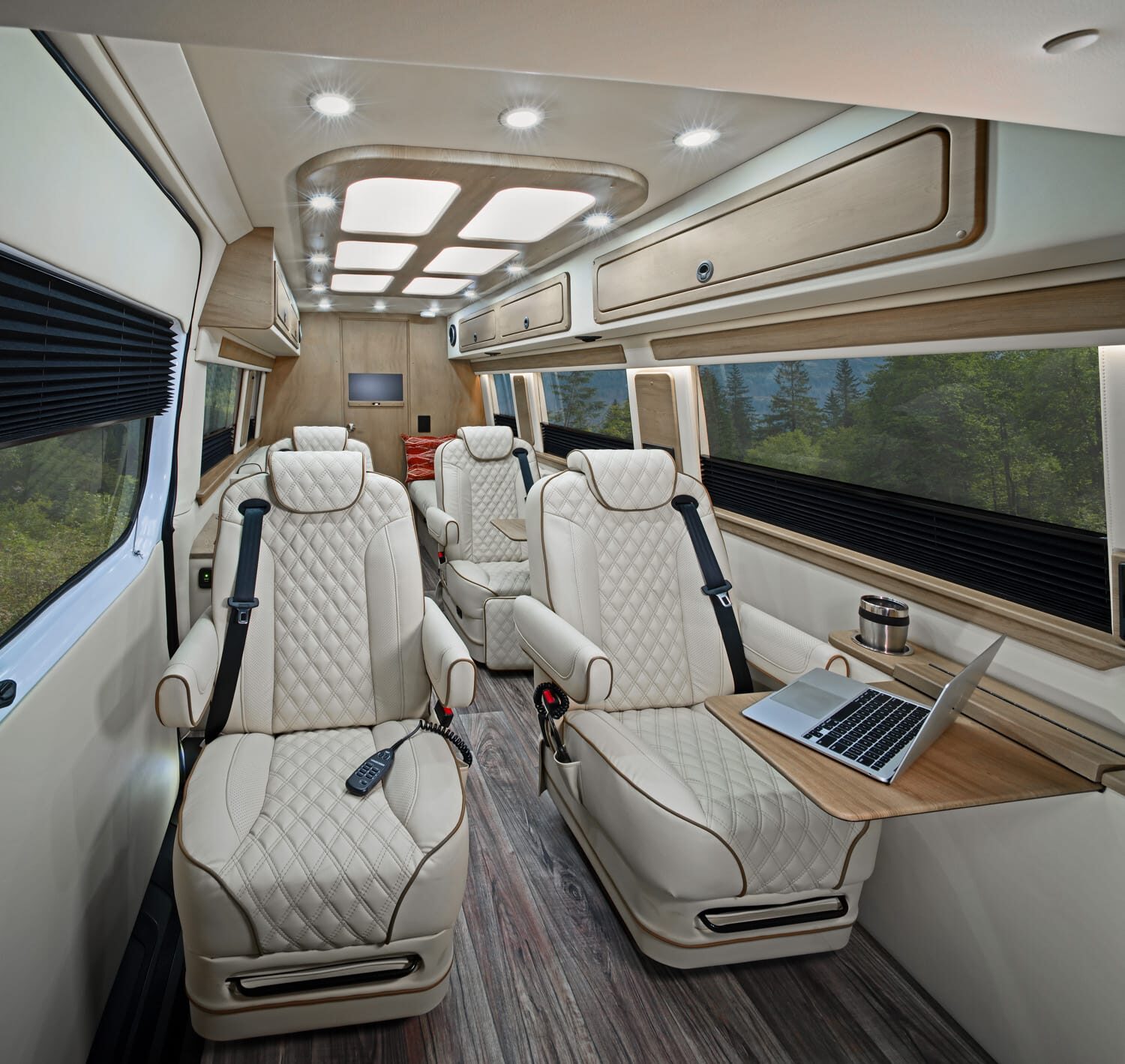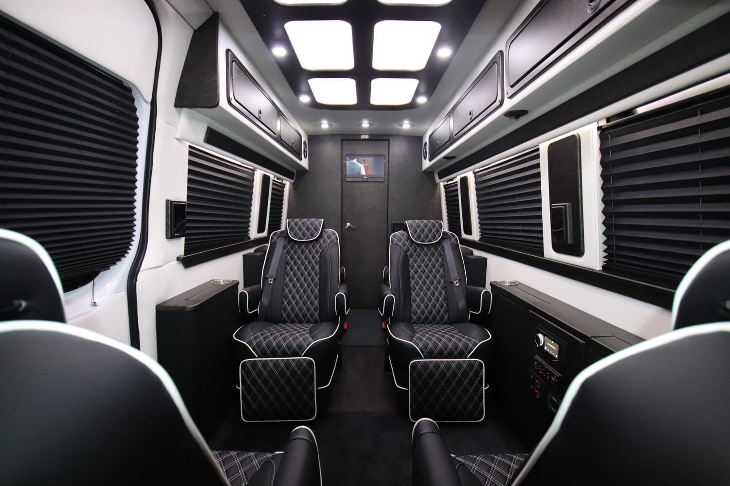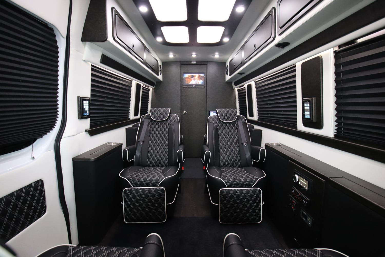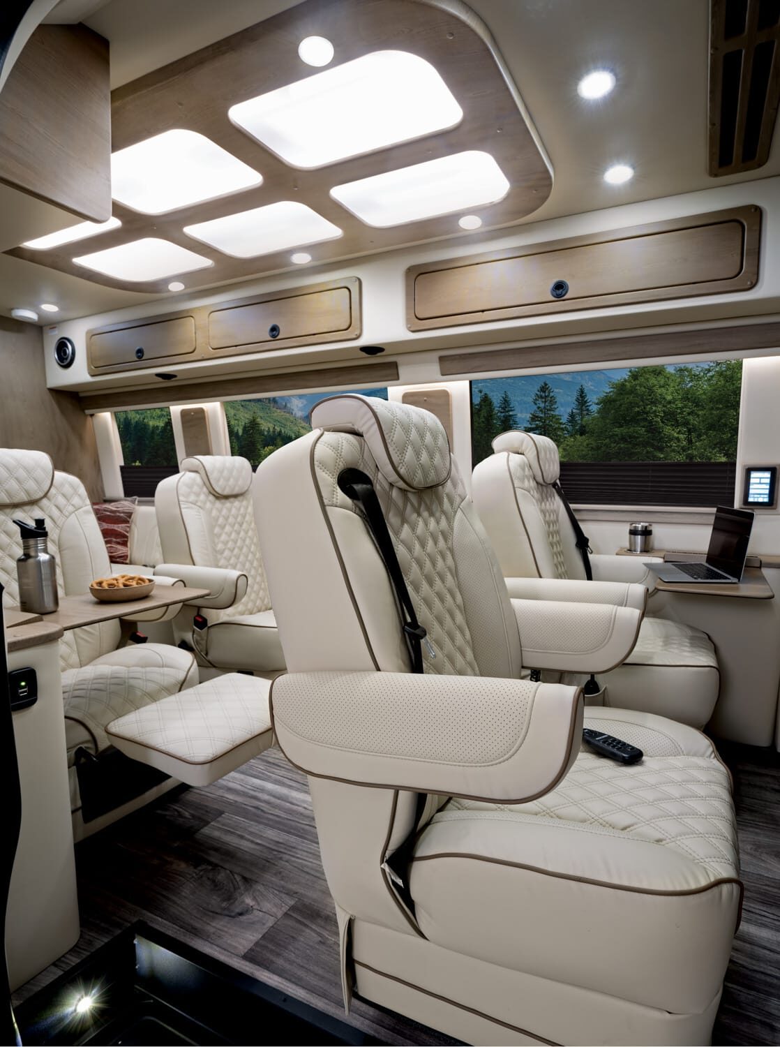 Full insulation, advanced rear climate control, and swivel captain’s chairs ensure comfort in any season. Privacy shades, tinted windows, storage solutions, and functional wall consoles with cup holders enhance the passenger experience.