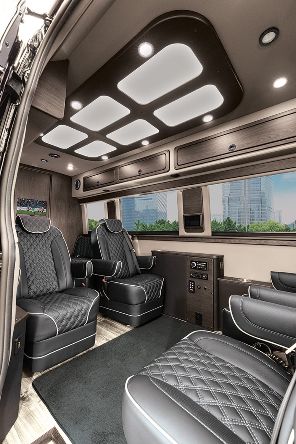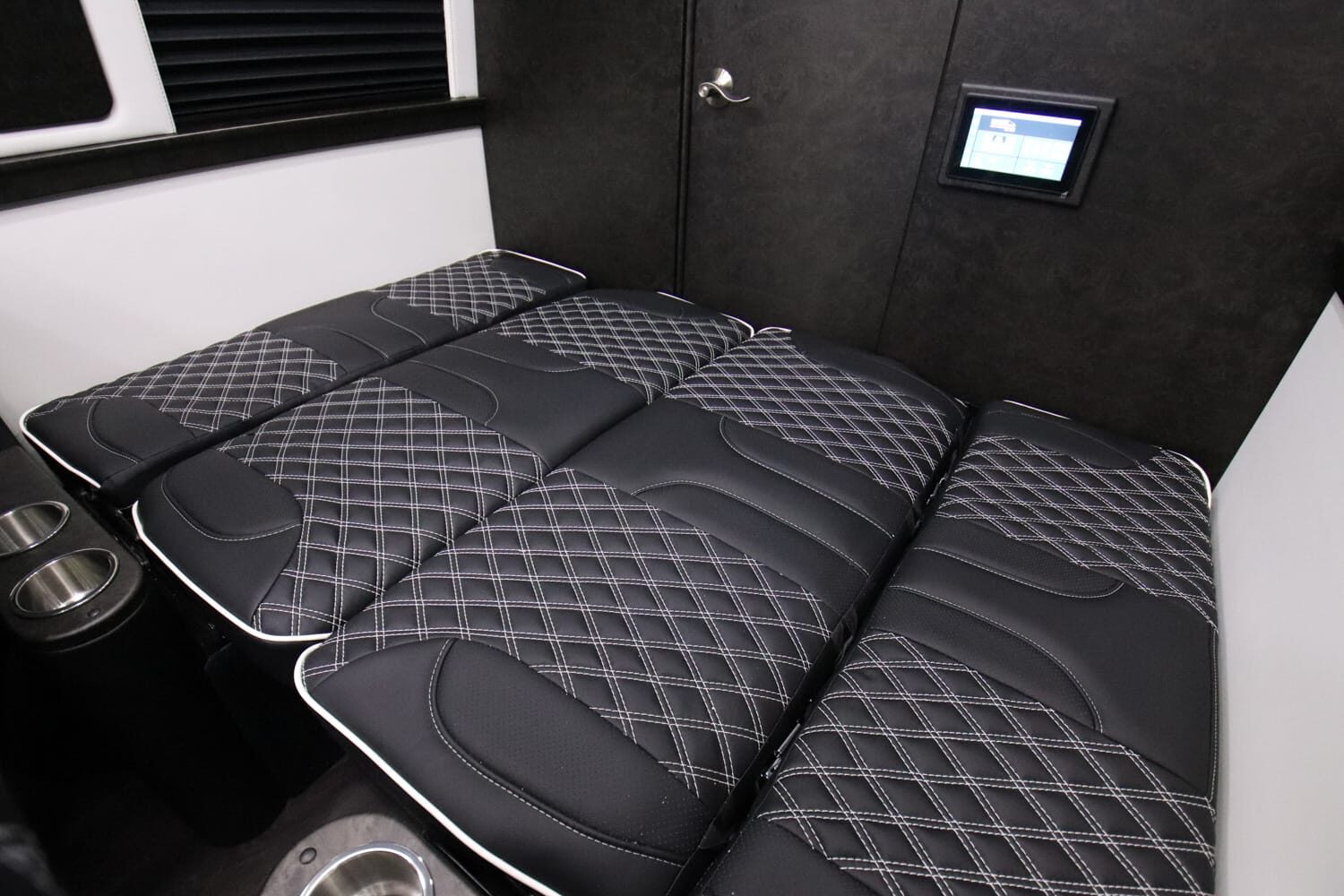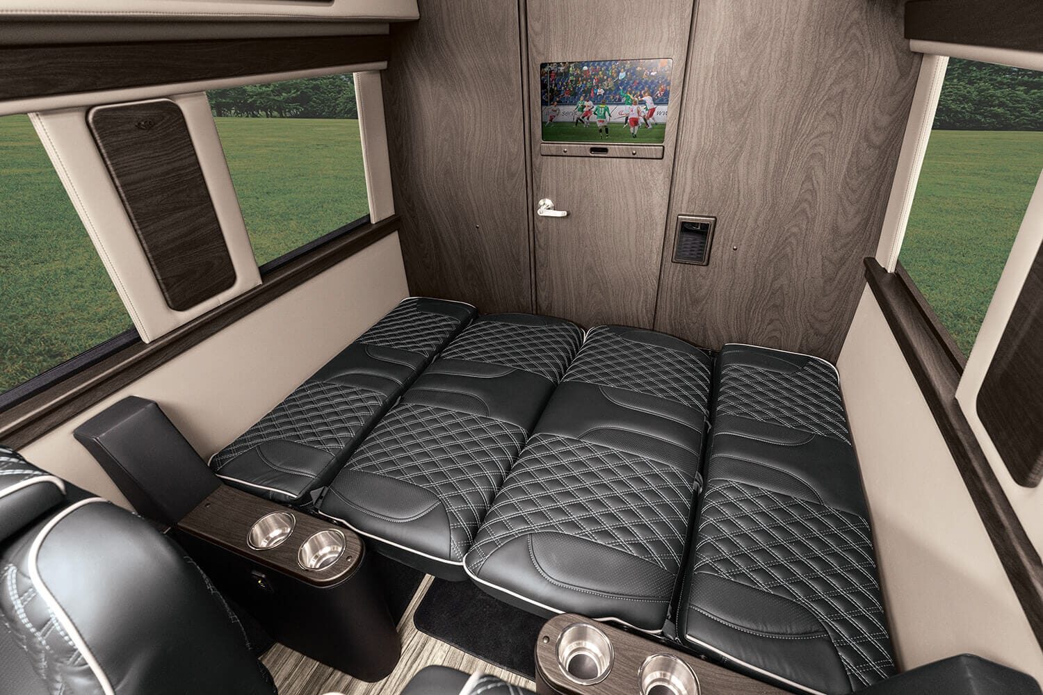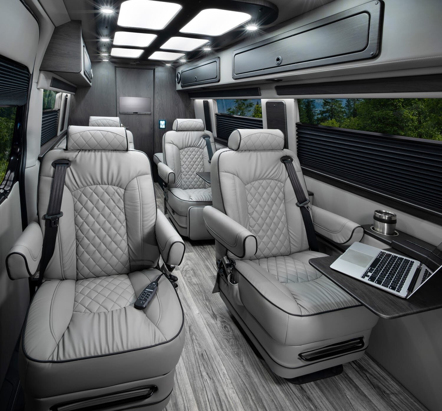Full insulation, advanced rear climate control, and swivel captain’s chairs ensure comfort in any season. Privacy shades, tinted windows, storage solutions, and functional wall consoles with cup holders enhance the passenger experience.