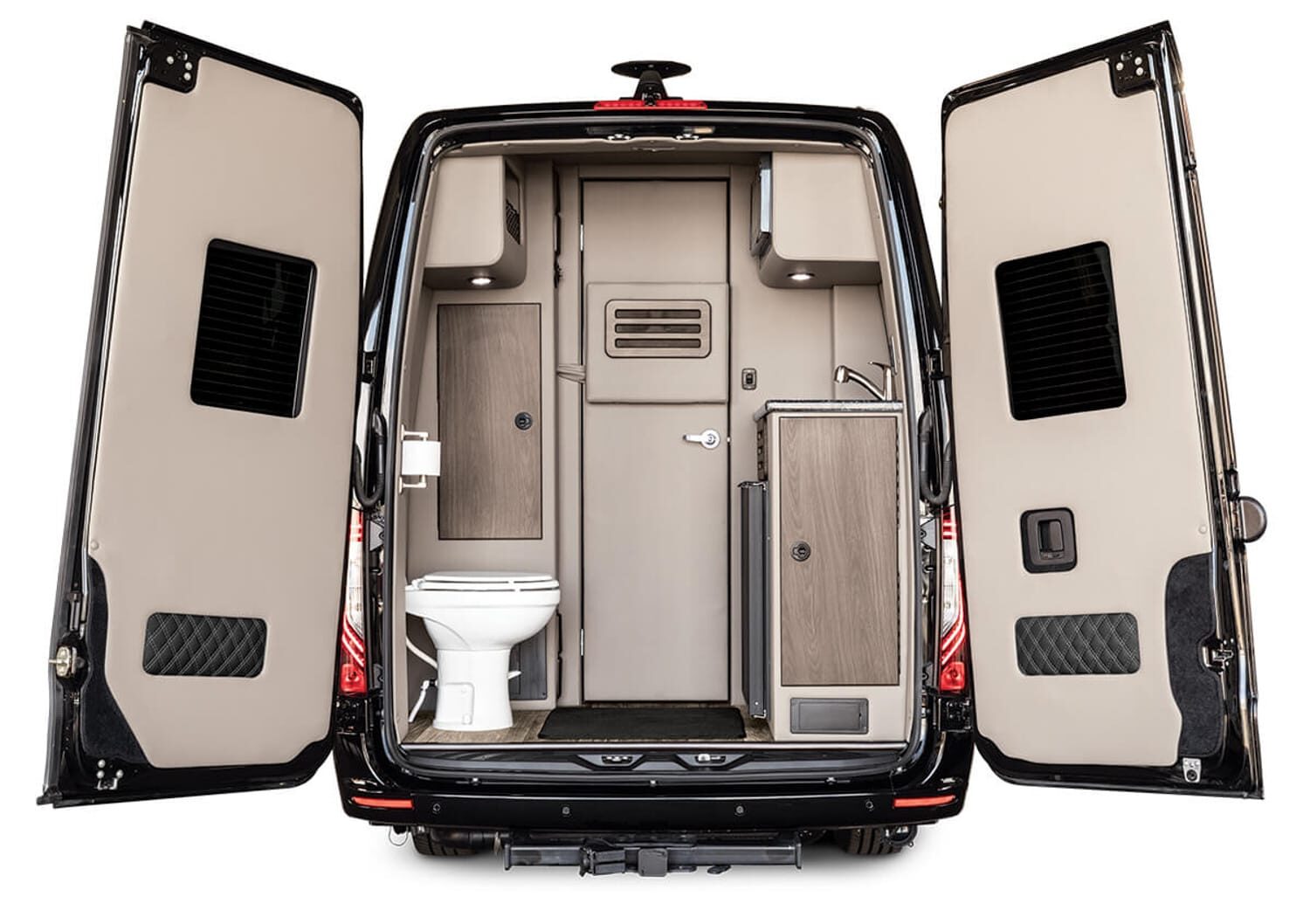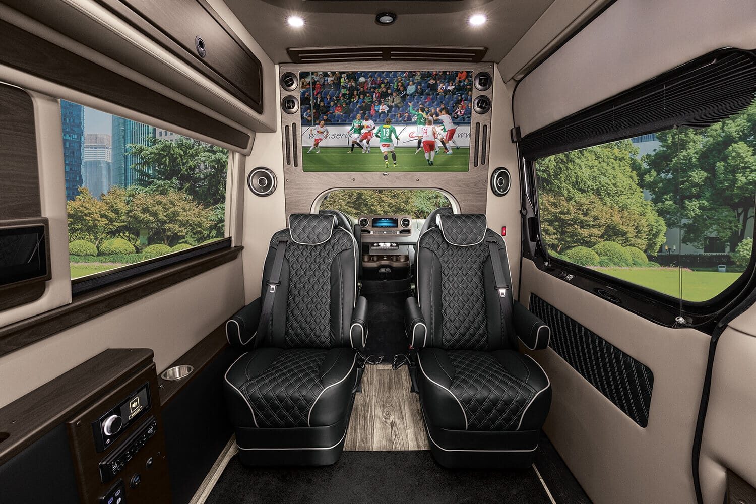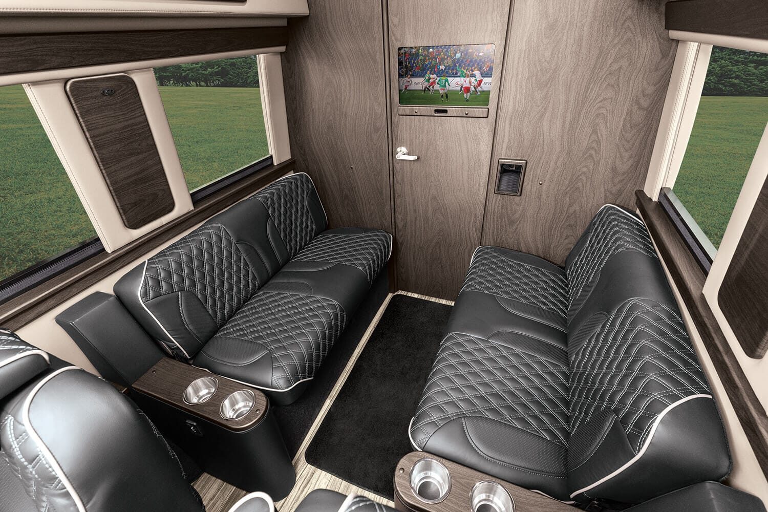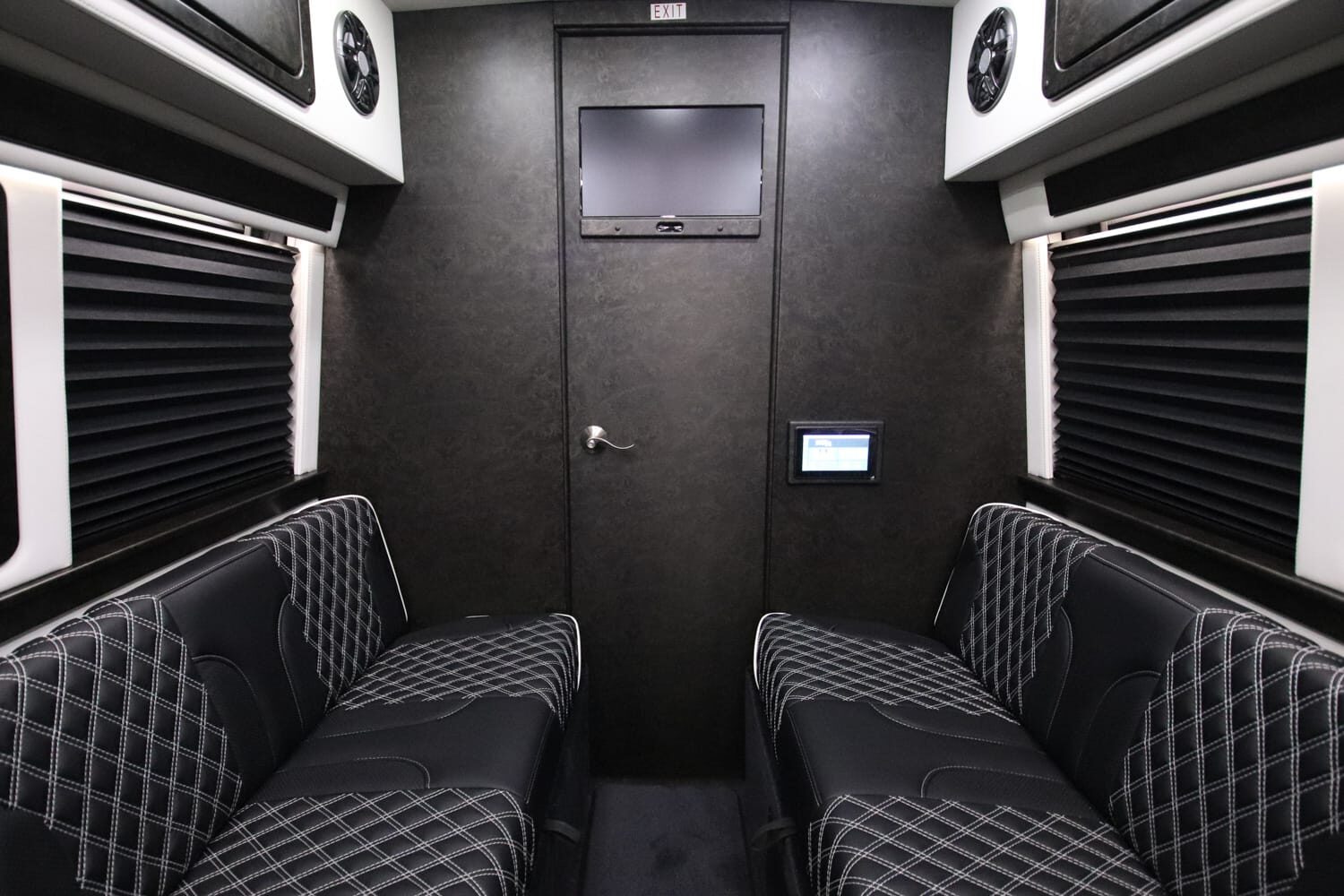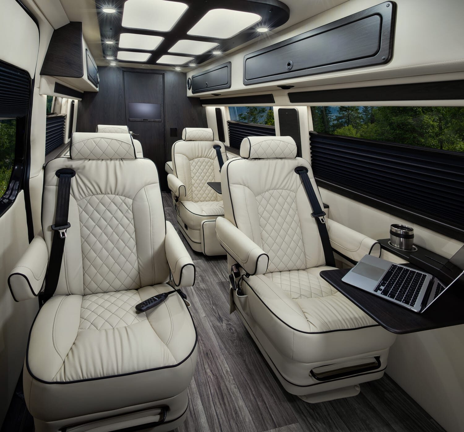 Full insulation, advanced rear climate control, and swivel captain’s chairs ensure comfort in any season. Privacy shades, tinted windows, storage solutions, and functional wall consoles with cup holders enhance the passenger experience.