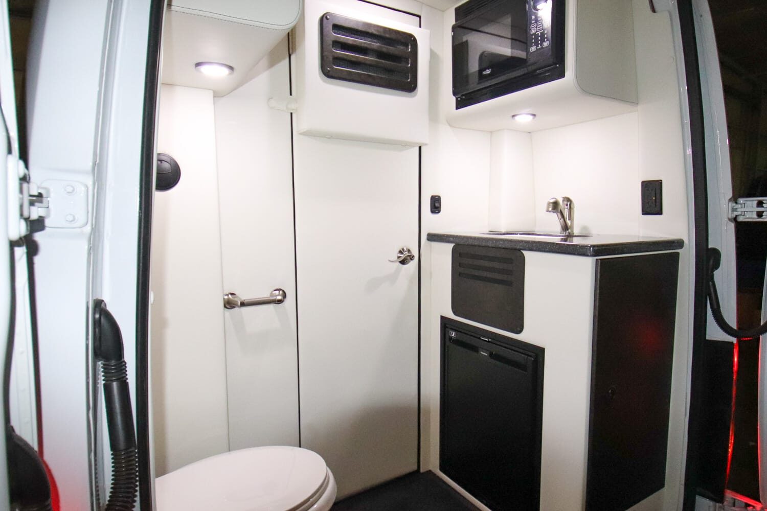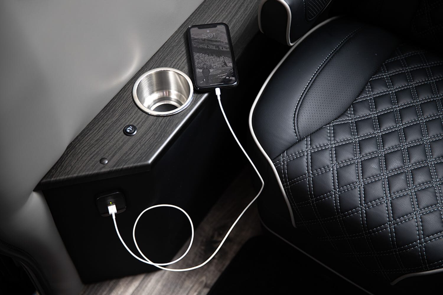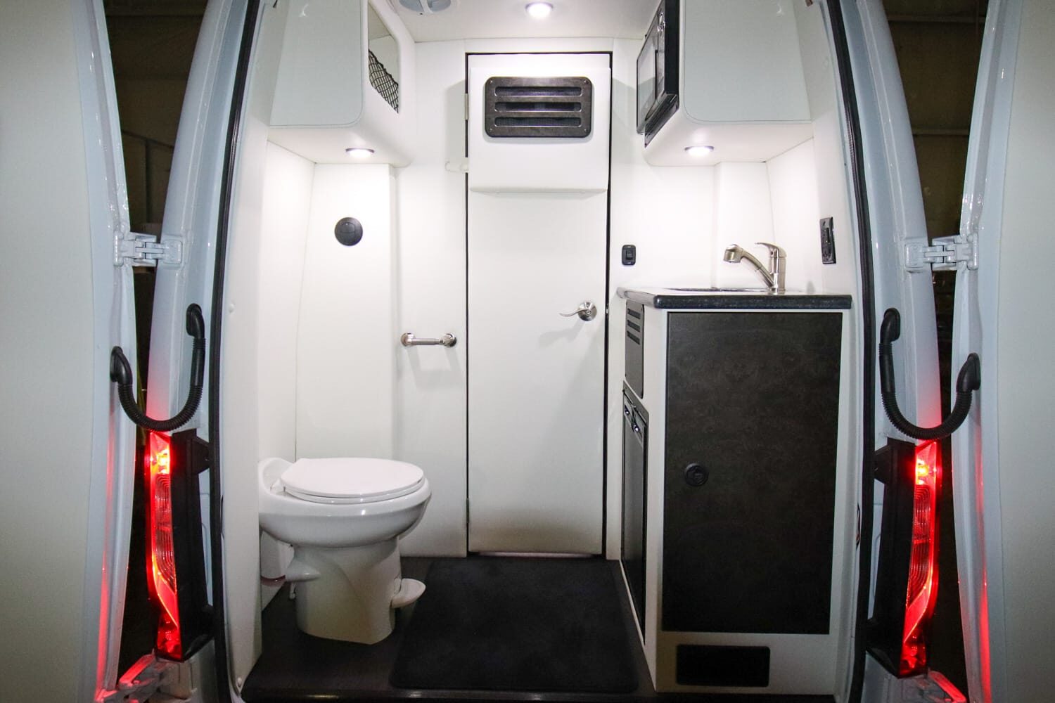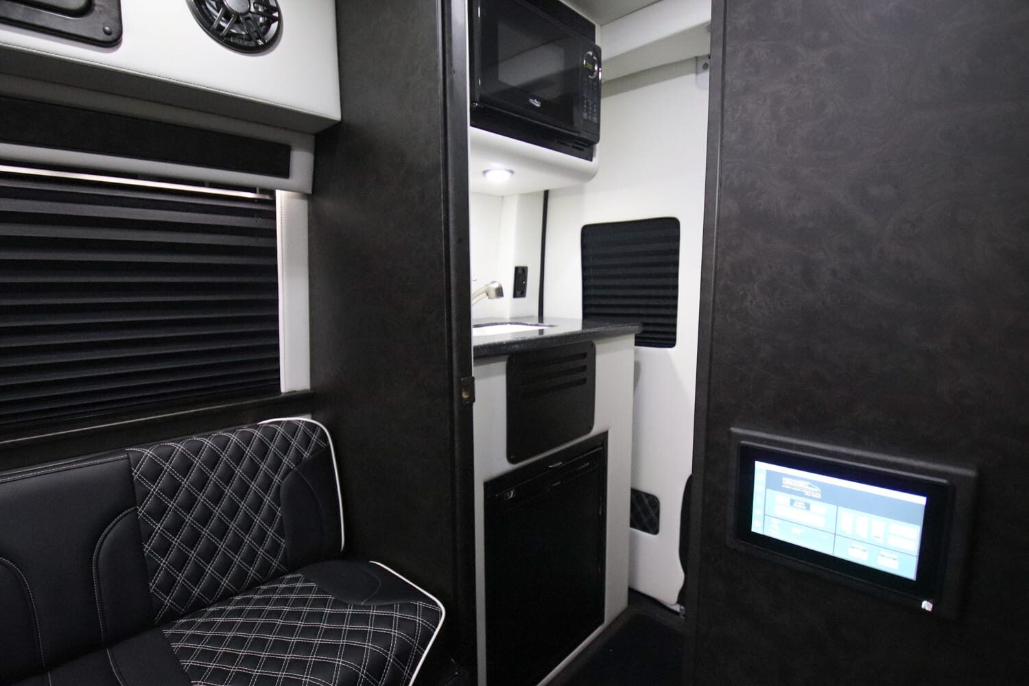 Full insulation, advanced rear climate control, and swivel captain’s chairs ensure comfort in any season. Privacy shades, tinted windows, storage solutions, and functional wall consoles with cup holders enhance the passenger experience.