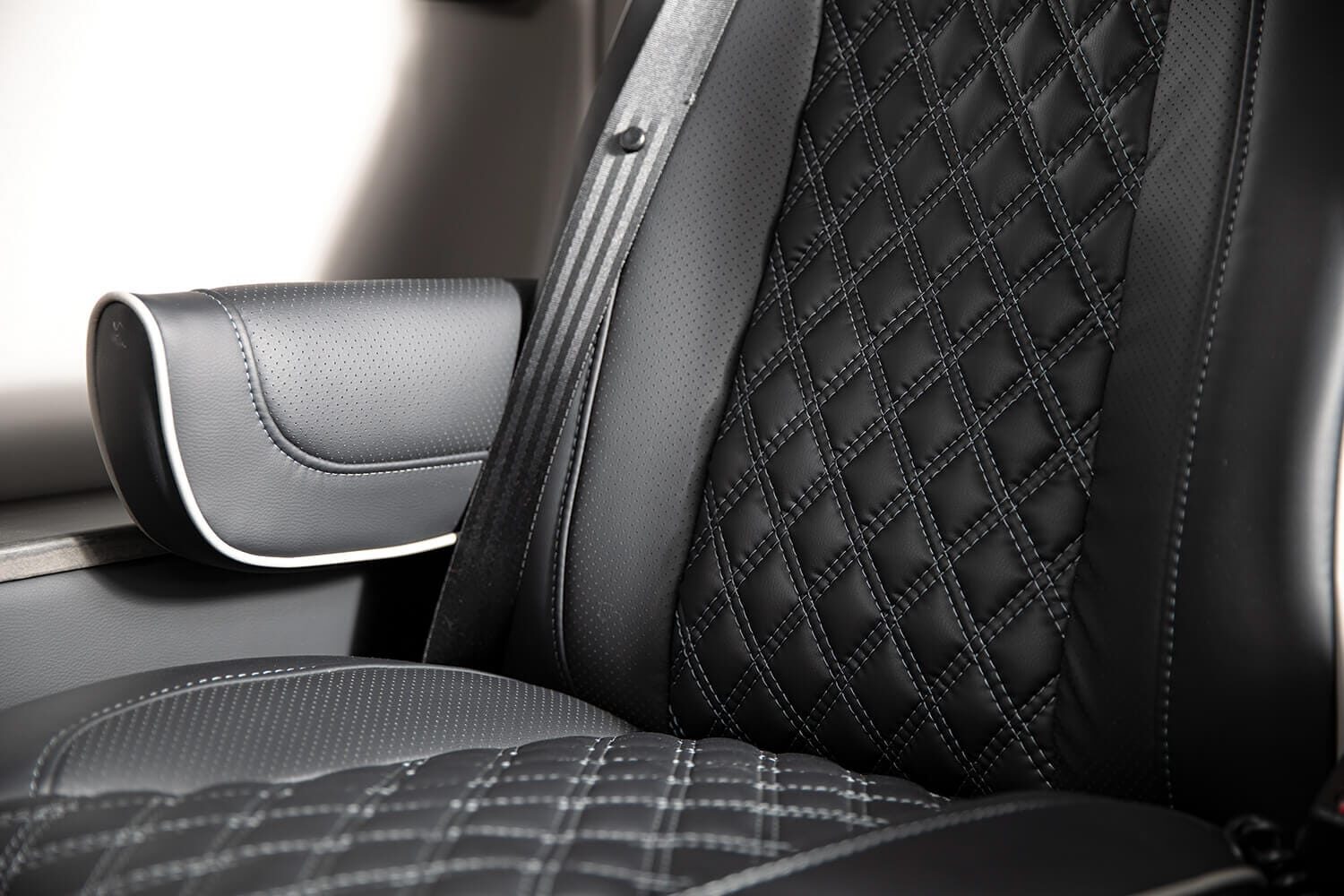 Precision embroidery featuring your team’s logo showcased on the rear partition wall, all headrests, and the interior of the rear doors for a unified, custom-finished cabin.